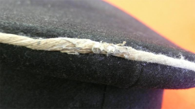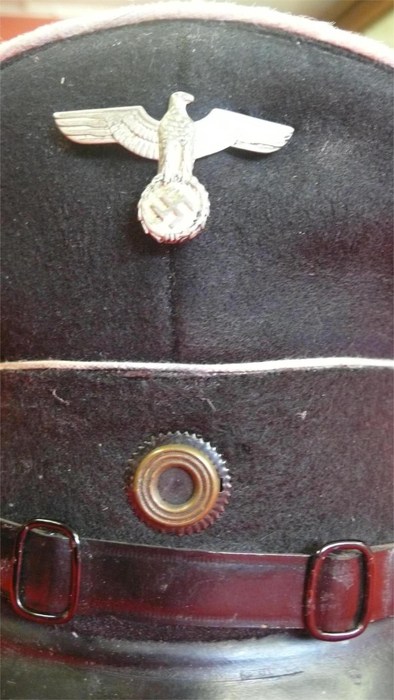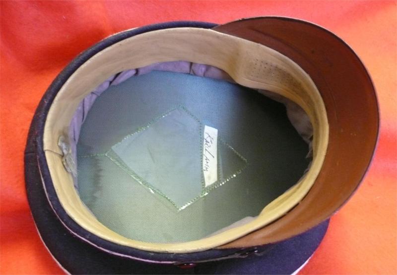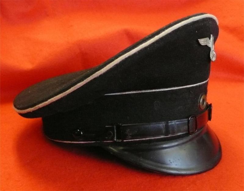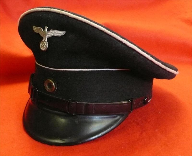 Nice saddle shaped cap, black wool body and band, army pattern NCO's chincord, Standard fibre peak, Weimar roundel and DAF or Rad cap eagle. Interior still retains its celloid trapezoid.