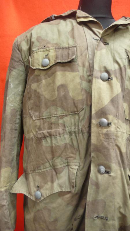In Italian camo material, this is a well used combat example, loosely based on the field grey SS kharkov parka.. No major damage , but some sheepskin has gone missing from the hood.