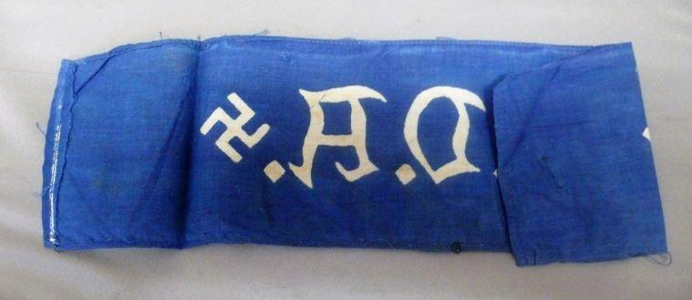 (The National League for the furthering of Germanism abroad) Constructed of blue cotton, the exterior bearing a white stylised inscription of "V.D.A." for Verein fur Deutschen im Ausland (Association of Germans abroad), flanked on each side by a mobile swastika.