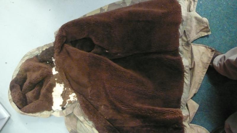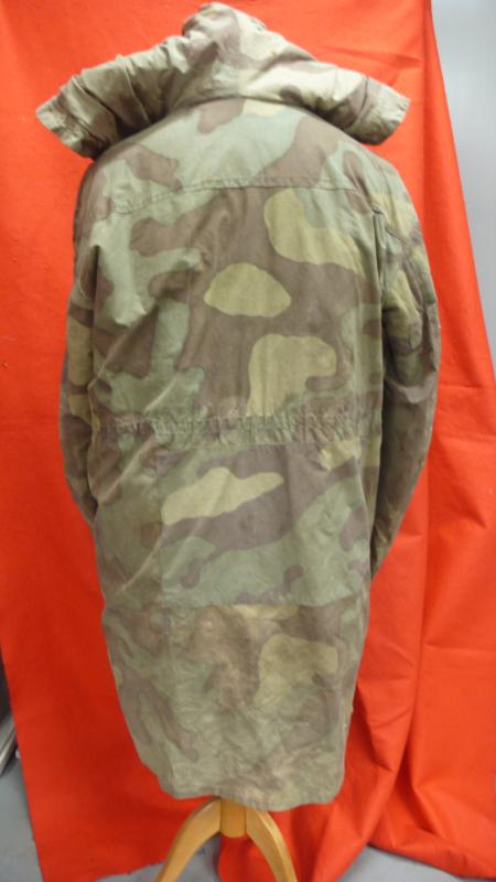 In Italian camo material, this is a well used combat example, loosely based on the field grey SS kharkov parka.. No major damage , but some sheepskin has gone missing from the hood.